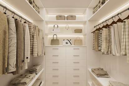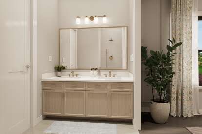 The primary bedroom offers a private retreat tucked away from the main living zones. 12 It includes generous window views, room for a comfortable bed and furnishings, and an attached ensuite bathroom with dual sinks, a shower, and an oversized walk-in closet that enhances practicality and everyday ease. 13