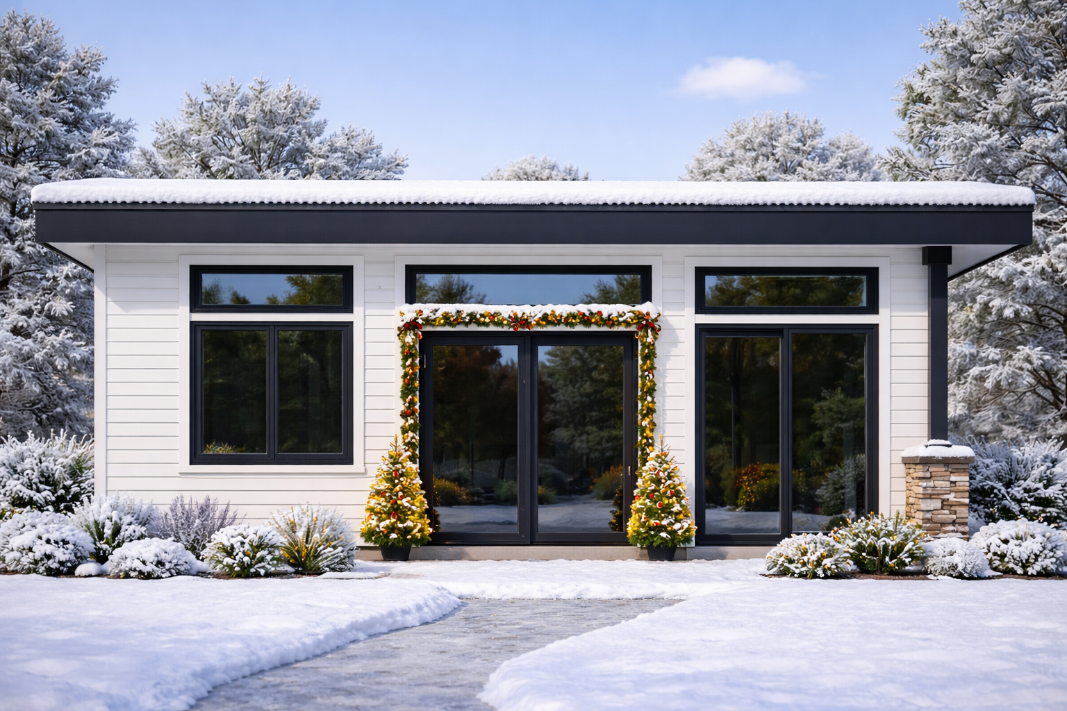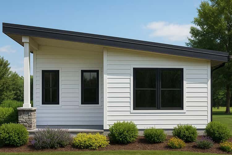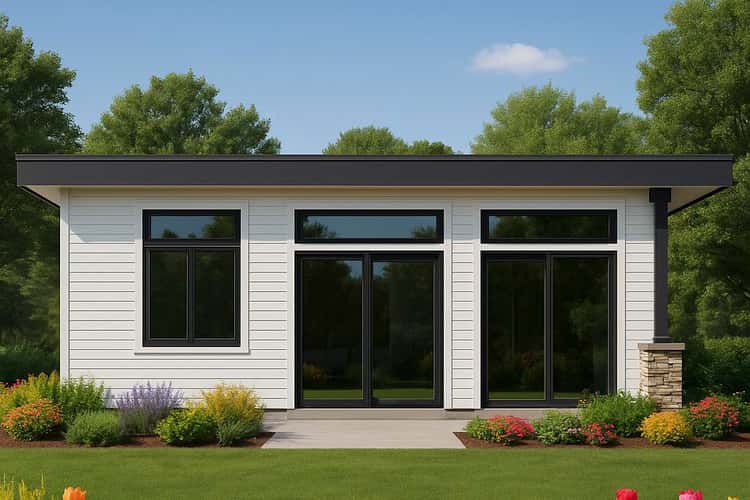 The exterior is contemporary in character with crisp horizontal siding, prominent black-framed windows and doors, and a contemporary single-slope roof that reinforces its modern aesthetic. Its compact profile fits comfortably on small lots or as a secondary dwelling adjacent to a primary residence. 1