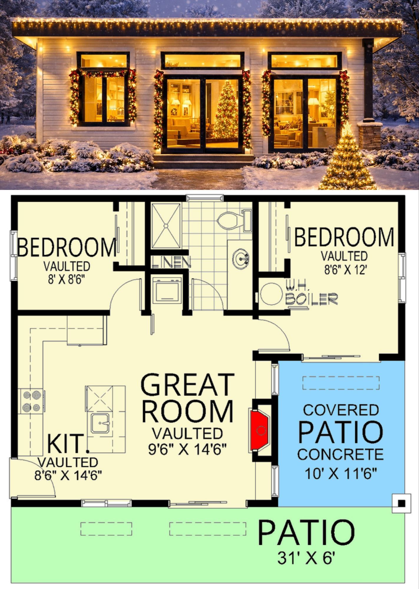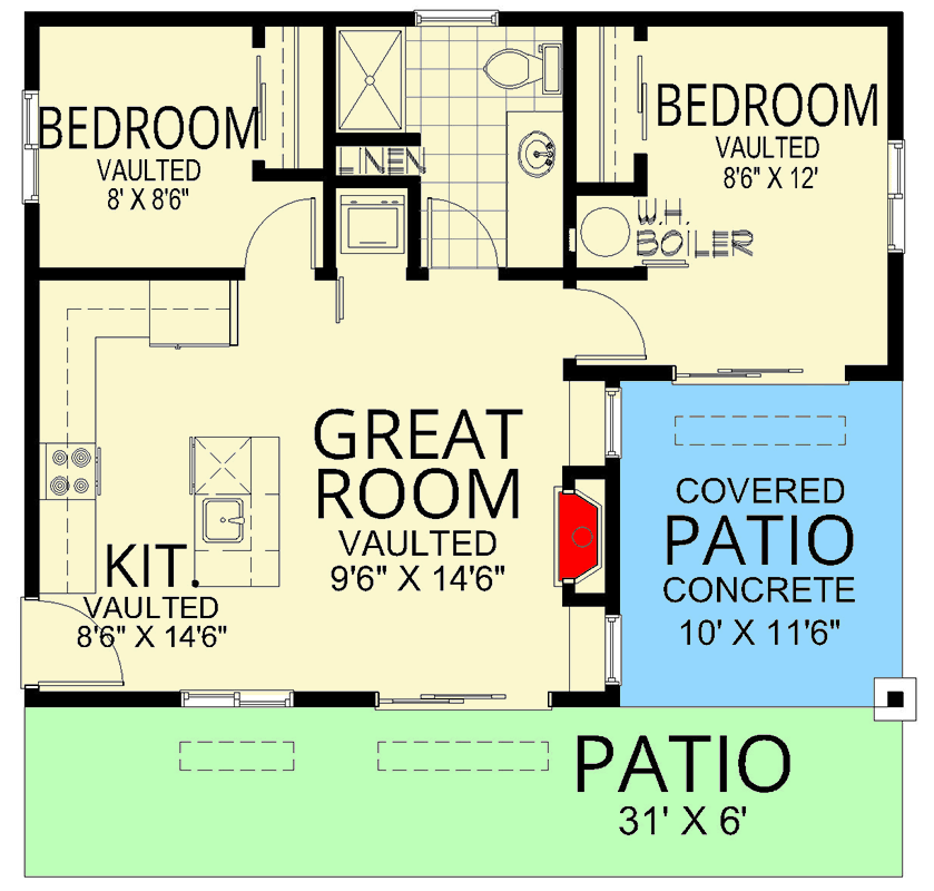 The plan is designed on a slab foundation with standard 2×6 exterior walls, giving the home structural strength and excellent insulation potential. Its modest dimensions—about **31′ 0″ wide × 24′ 6″ deep** with a **max ridge height of 11′ 10″**—keep the build efficient while still providing comfortable headroom and volume. 15 With ceilings ranging from 8′ in the bedrooms to 10′ in the vaulted great room, the design balances cozy and open atmospheres elegantly. 16