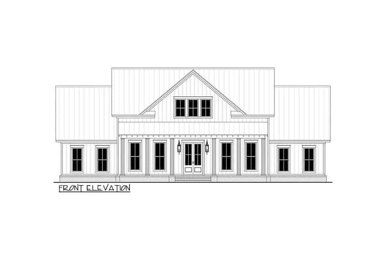 The façade makes a memorable first impression with a broad covered front porch framed by a shed roof and exposed rafter tails that evoke classic farmhouse character. 1 Board-and-batten siding stretches across the main level and gables, giving a refined yet approachable texture that feels at home on both rural and suburban sites. 2 Thoughtful window placement enhances curb appeal while promising abundant daylight inside. 3