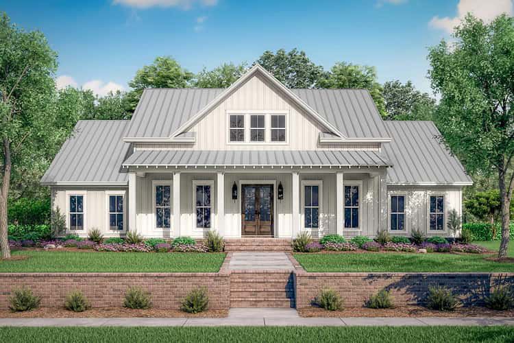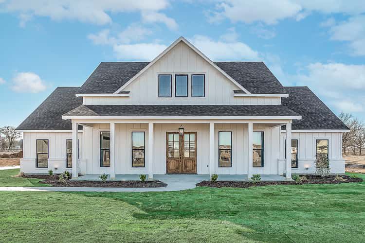 - Classic farmhouse style with modern appeal and broad covered porch space.