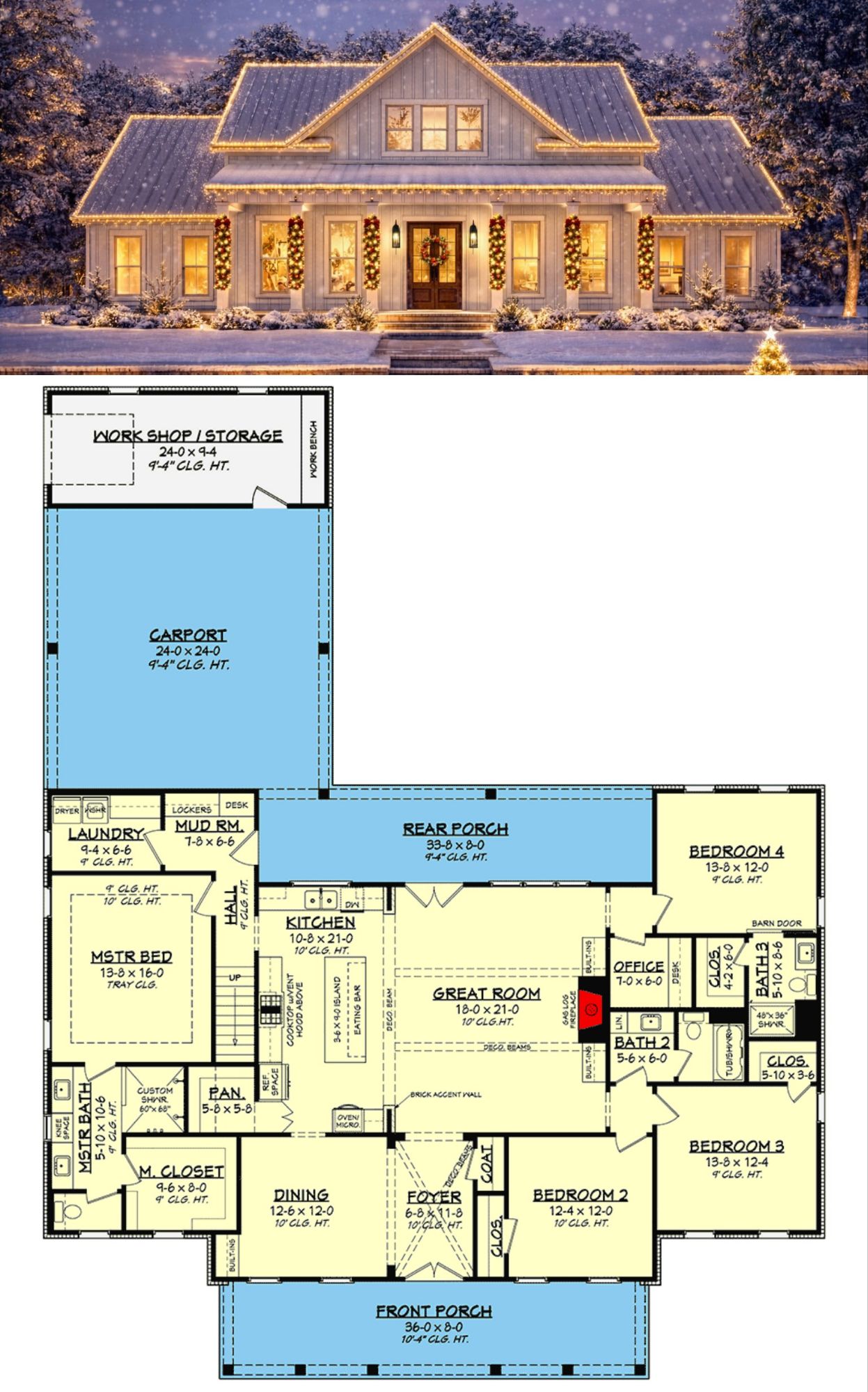 This sophisticated modern farmhouse plan delivers about 2,390 sq ft of beautifully balanced living space built for everyday family life, entertaining, and timeless style. With a thoughtful split-bedroom layout featuring 4 bedrooms (plus optional 5th), 3 to 4 bathrooms, an attached 2-car carport/garage (~576 sq ft), and a generous open design that invites natural light and social flow throughout, this home combines classic farmhouse charm with modern living comforts. 0