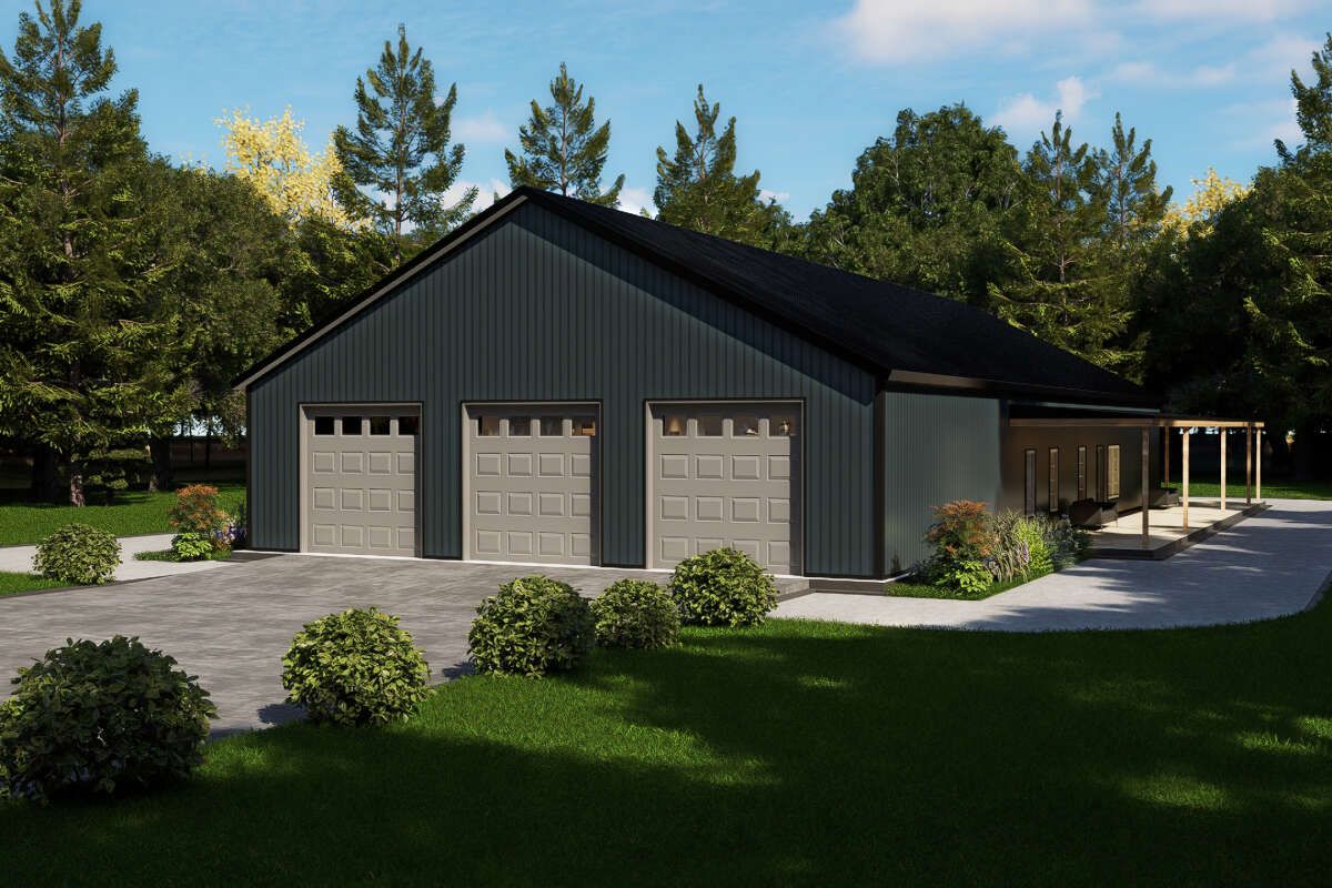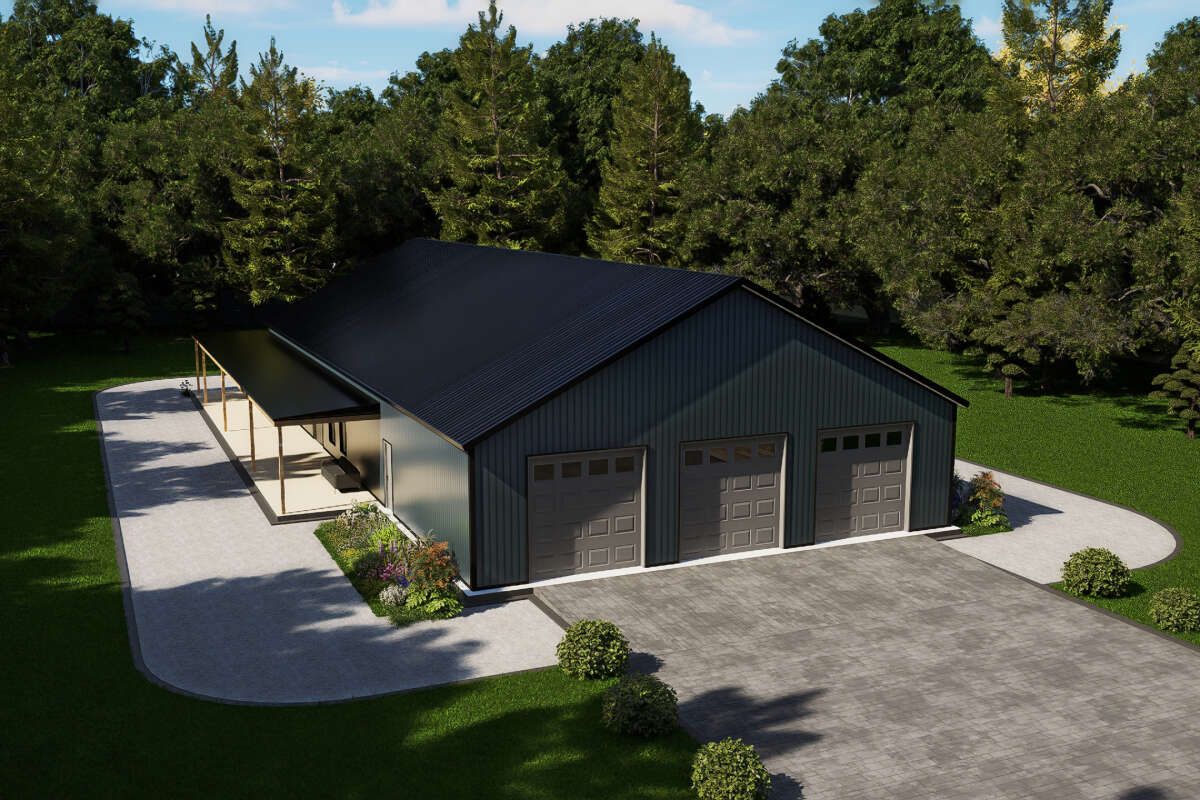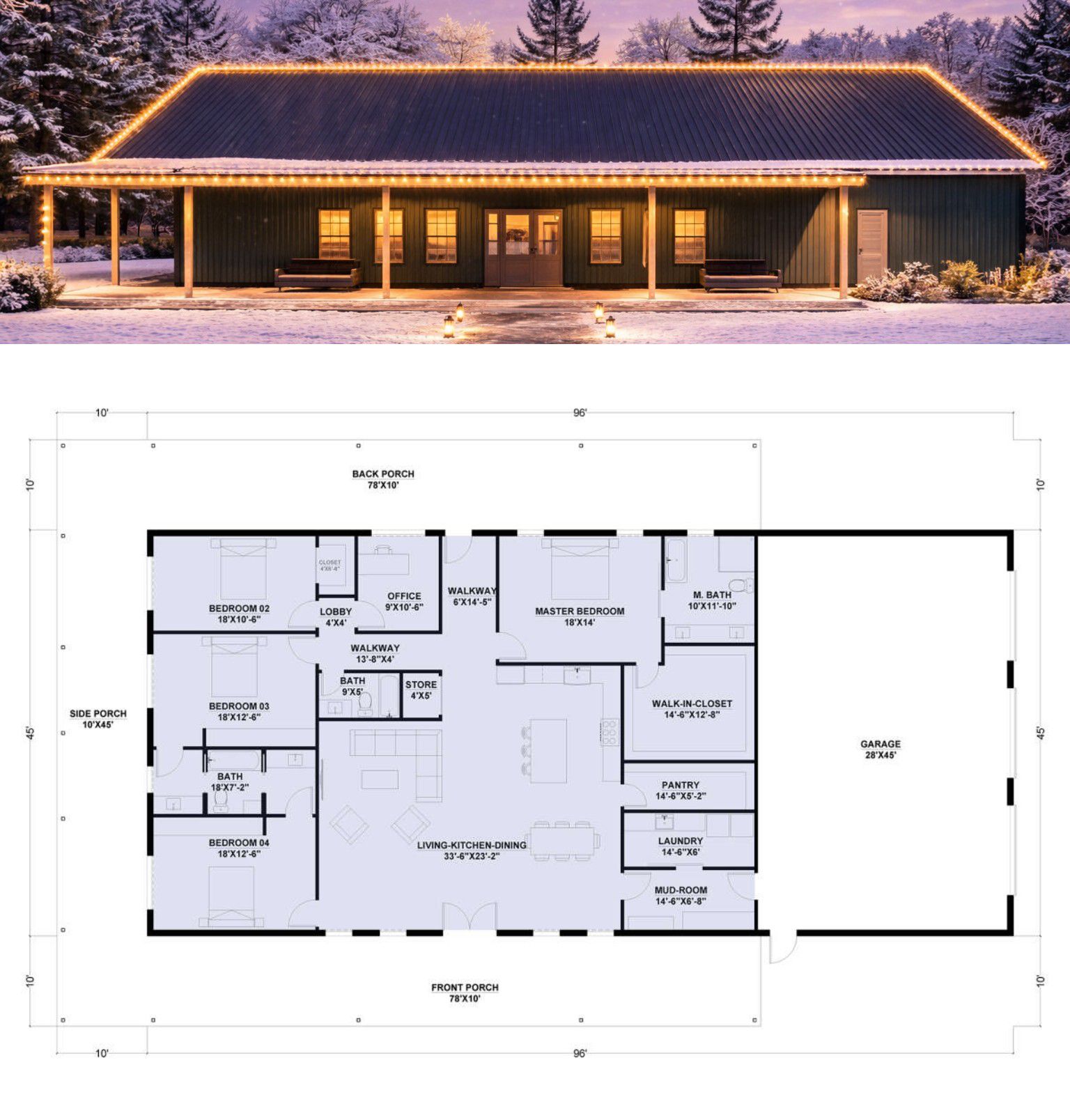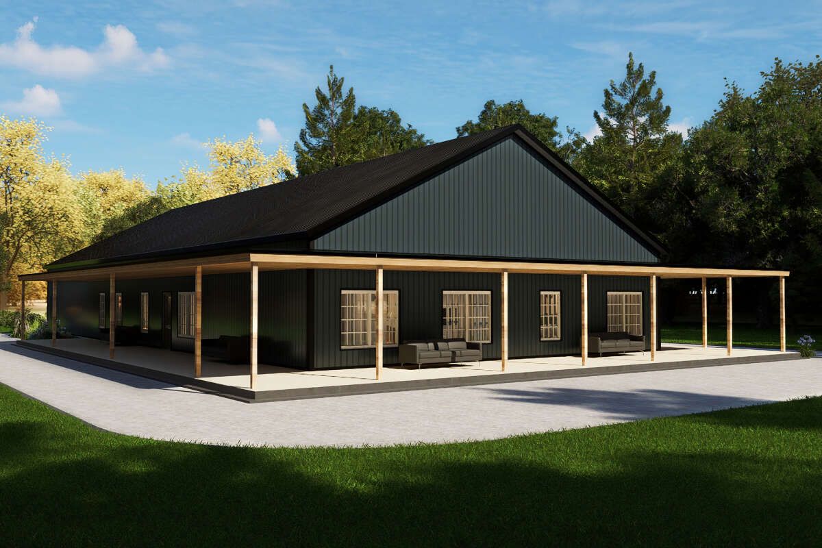 The exterior presents a striking and modern barn-style façade that marries rustic character with refined details. Clean vertical siding and a dramatic roofline give the home a bold, yet timeless look that stands out on country lots or suburban acreage alike. 1 A spacious covered front porch welcomes guests and encourages outdoor living from the moment you arrive. 2 At roughly 72′ wide × 59′ deep, this barndominium sits comfortably on larger lots and makes a strong visual impact without feeling overwhelming. 3