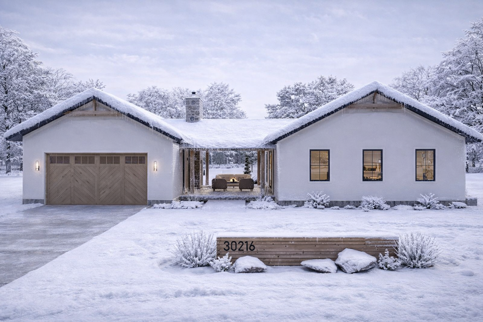 The exterior presents a timeless cottage style with balanced proportions and a welcoming appearance. With overall dimensions of approximately 68 feet wide and 64 feet 8 inches deep, the home offers a wide and well-grounded footprint. 1