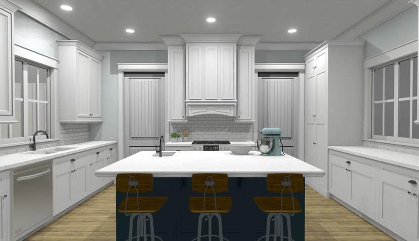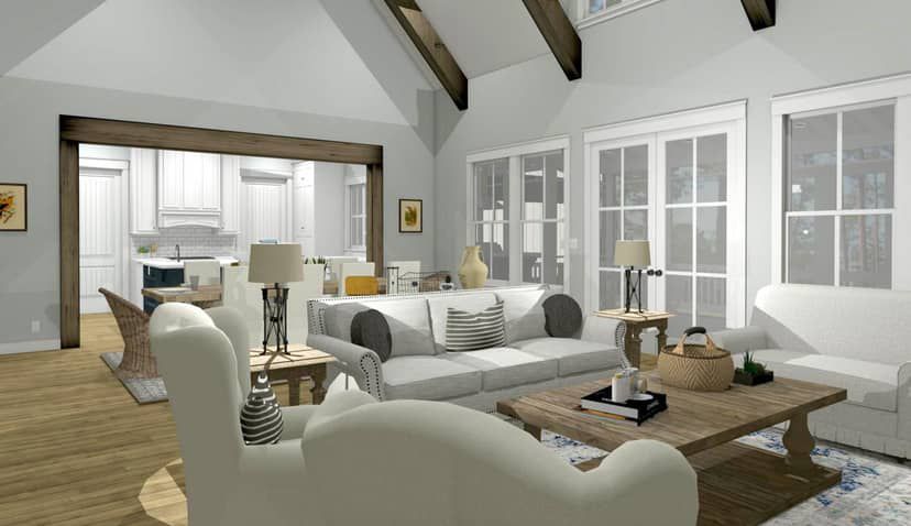 The exterior of this plan reflects an elevated farmhouse aesthetic: clean, symmetrical lines, balanced rooflines, and a welcoming covered front porch. Architectural elements like crisp siding, thoughtful trim detailing, and large windows create a look that feels both classic and current. The result is a home that stands out for its elegant simplicity and strong curb appeal.