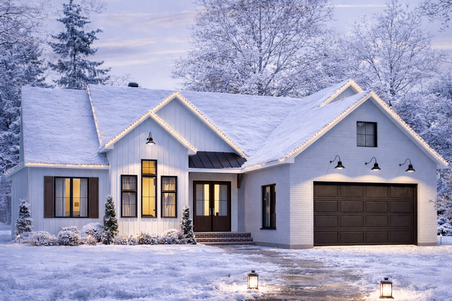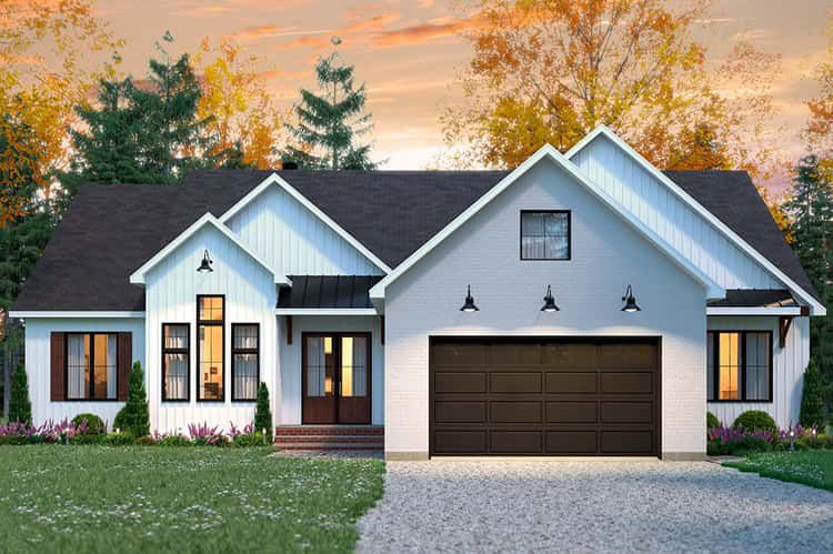 The exterior combines board-and-batten siding with brick accents for a fresh yet grounded aesthetic that bridges New American, modern farmhouse, and Craftsman influences. 1 A front-facing attached 2-car garage (~547 sq ft) sits slightly offset, helping balance the façade and create an appealing street presence while subtly improving privacy for the master suite. 2 Elegant gable rooflines and mixed materials give the home a welcoming, timeless character with exceptional curb appeal. 3