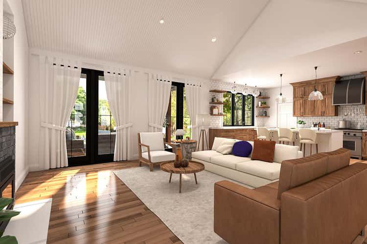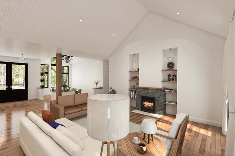 At the heart of this design, the living room and dining area enjoy vaulted ceilings that create a sense of expanse and airiness. 7 Large windows flood these shared spaces with natural light, enhancing the feeling of openness and inviting seamless indoor-outdoor connection. 8 A comfortable layout accommodates a variety of furniture arrangements, making this a great place for gatherings or everyday relaxation. 9