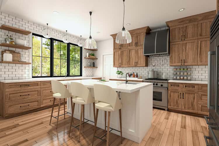 The kitchen opens to the main living areas and includes a generous island with seating for three — perfect for casual meals or conversation while cooking. 10 A large walk-in pantry offers substantial storage space so counters can stay clutter-free. 11 The adjacent dining zone sits under vaulted ceilings and benefits from clear sightlines across the living space. 12