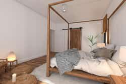 The primary bedroom suite is tucked toward one side of the home to enhance privacy. 13 Inside, space for a comfortable bed and furnishings creates a restful retreat from the main living areas. 14 The attached ensuite bathroom boasts dual walk-in closets separated by a sliding barn door for a touch of modern rustic flair — a thoughtful detail that blends convenience with style. 15