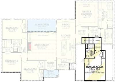 On the other side of the house, the plan offers multiple additional bedrooms. Two or three secondary bedrooms share a hall bath — a practical arrangement for children, guests, or roommates. 7