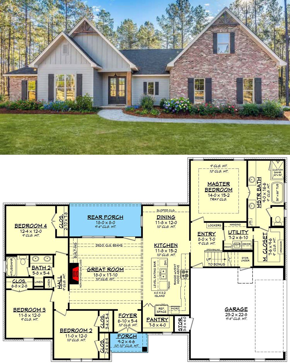 • Layout Highlights: Split-bedroom layout (master separated from secondary), open great room + kitchen + dining, exposed beams, walk-in pantry, rear porch, simple footprint ideal for many lot sizes. 13