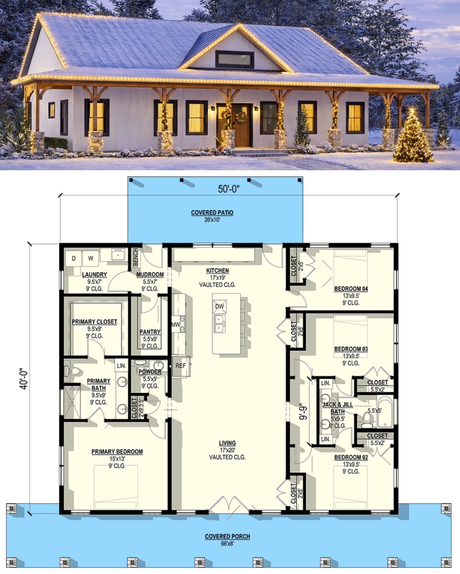 The exterior is all about relaxed, everyday charm. The home stretches across a footprint of about 50′ wide × 40′ deep, giving it a balanced, grounded presence that suits many lot types. It feels welcoming without being flashy—like the kind of home you’d happily come back to after a long day and immediately breathe easier just pulling into the driveway.