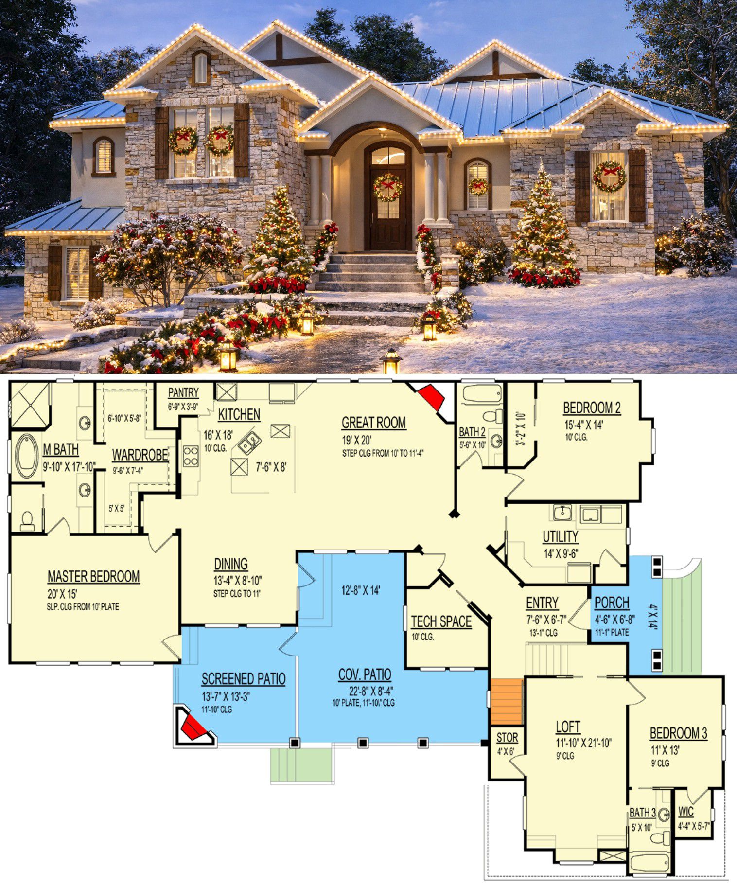 This generously proportioned single-story house plan offers approximately 3,285 sq ft of thoughtfully designed living space with a smart *split-bedroom layout*, abundant natural light, and abundant room for everyday life and entertaining. With 3 bedrooms, 3 full bathrooms, a flexible loft space, and generous covered outdoor living areas with a fireplace and screened porch, this plan blends comfort, style, and functionality for modern family living. 0