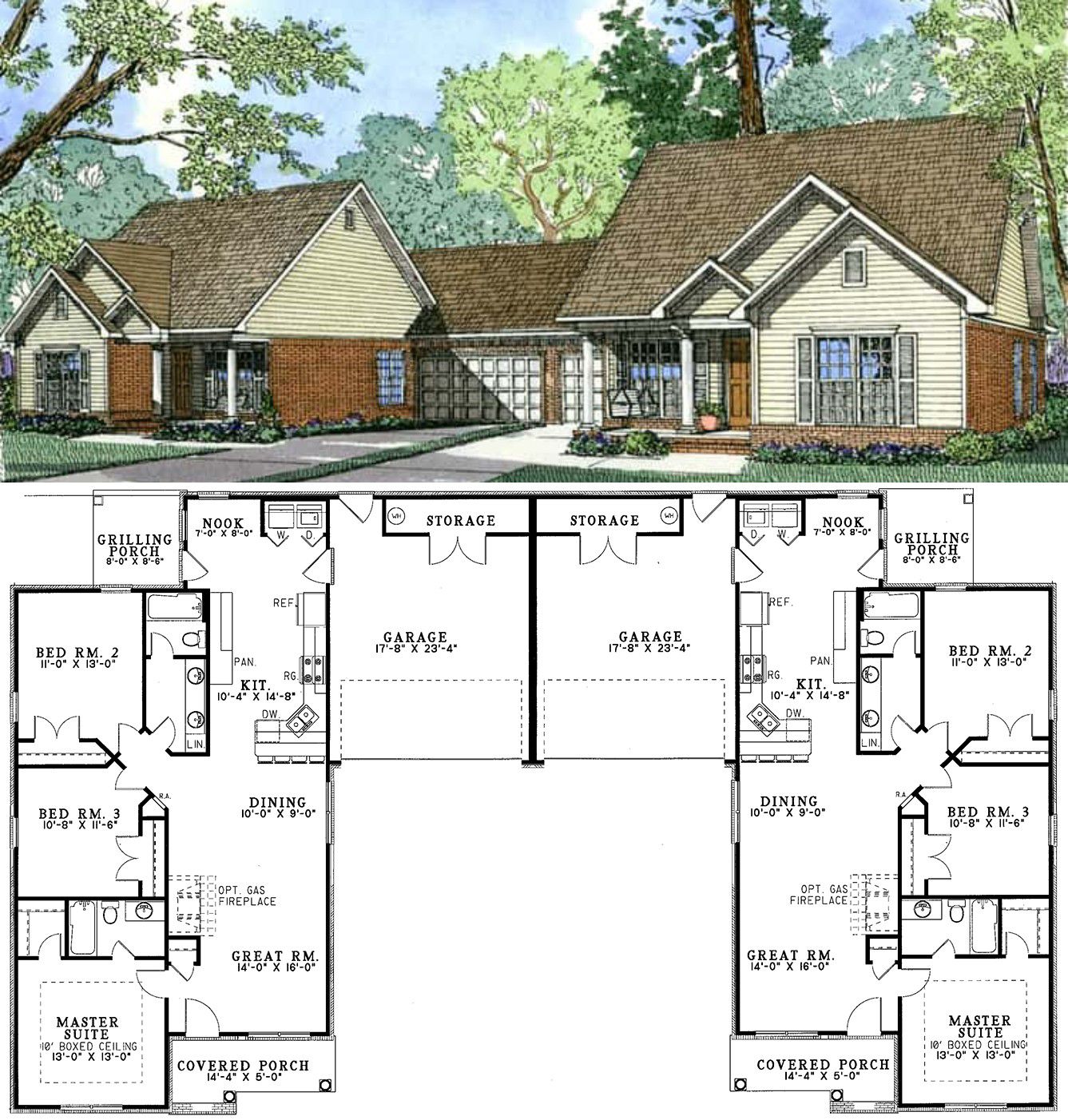 This duplex plan offers two mirror units, each around 1,318 sq ft of heated living space — so the total built area comes to about 2,636 sq ft. Each unit includes 3 bedrooms, 2 full baths, and an attached ~412 sq ft garage. With a layout that mixes cozy living spaces and functional design, it’s a strong choice whether you want to live in one unit and rent out the other, share with extended family, or house two households under one roof. 0
