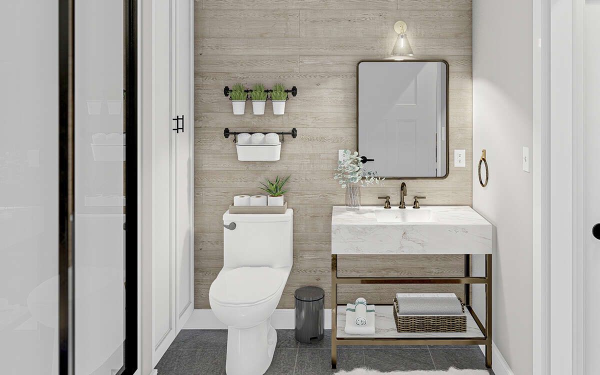 The design includes one full bathroom, conveniently located to serve both the bedroom and living area. 4