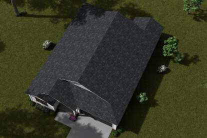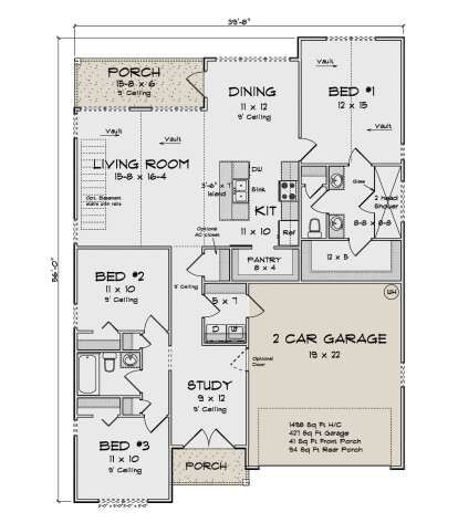 The exterior of this traditional plan balances welcoming charm with clean, functional lines. 1 Spanning about 39′-8″ wide × 56′ deep, the façade offers a friendly profile that fits both suburban and rural lots. 2 A covered front porch introduces the home with classic appeal, providing a sweet spot for morning coffee or greeting neighbors while setting the tone for the comfortable life inside. 3