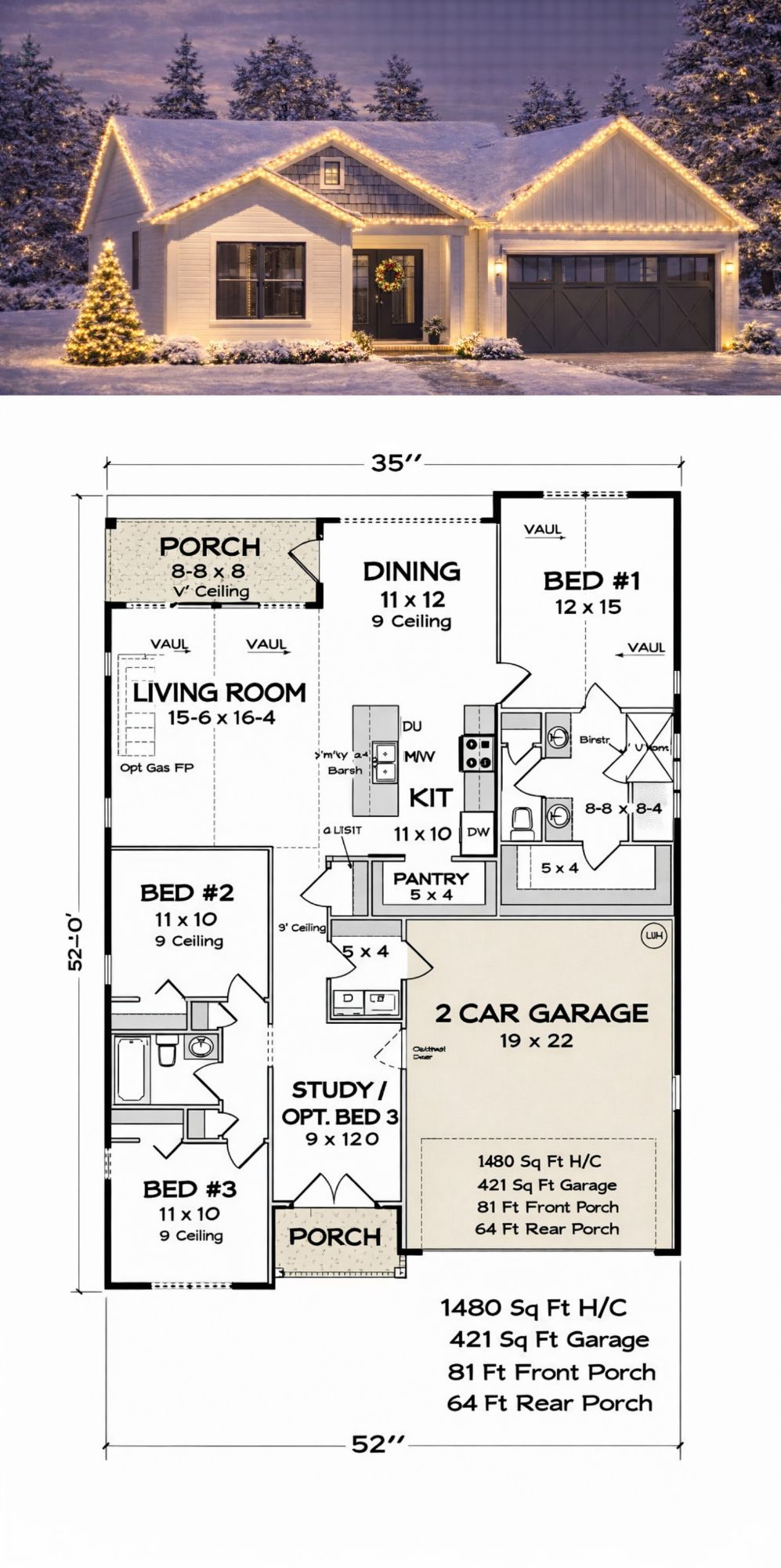 This traditional home plan offers about 1,498 sq ft of comfortable, well-planned living space, designed with everyday convenience and timeless appeal in mind. With 3 bedrooms, 2 full bathrooms, and an attached 2-car garage (~427 sq ft), this single-story layout blends classic architectural simplicity with thoughtful interior flow — perfect for families, downsizers, or anyone seeking efficient, stylish living. 0