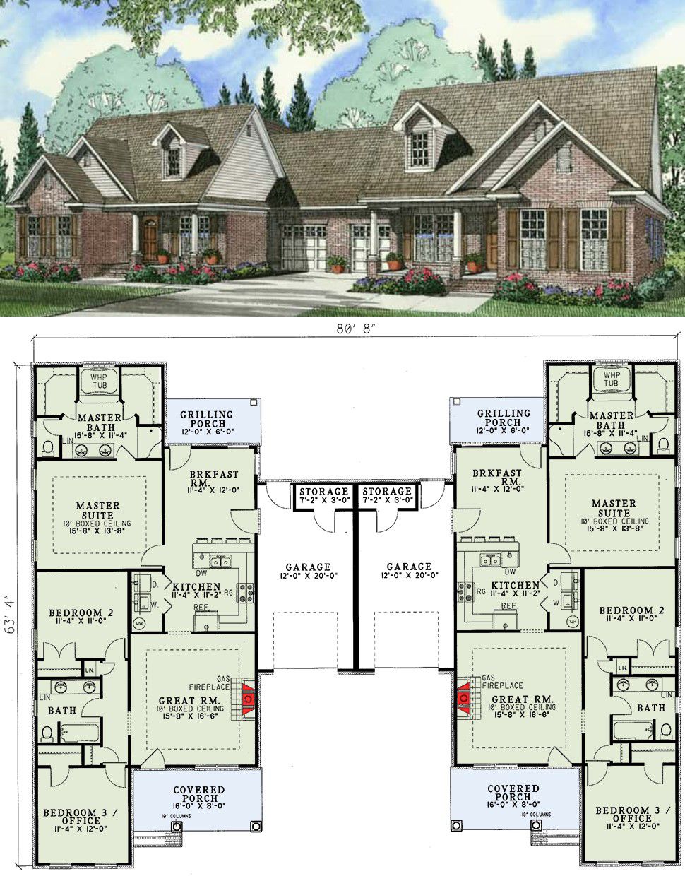 - Unit Footprint (each): ~40′ 4″ wide × 63′ 4″ deep; roof ridge ~23′ high 0