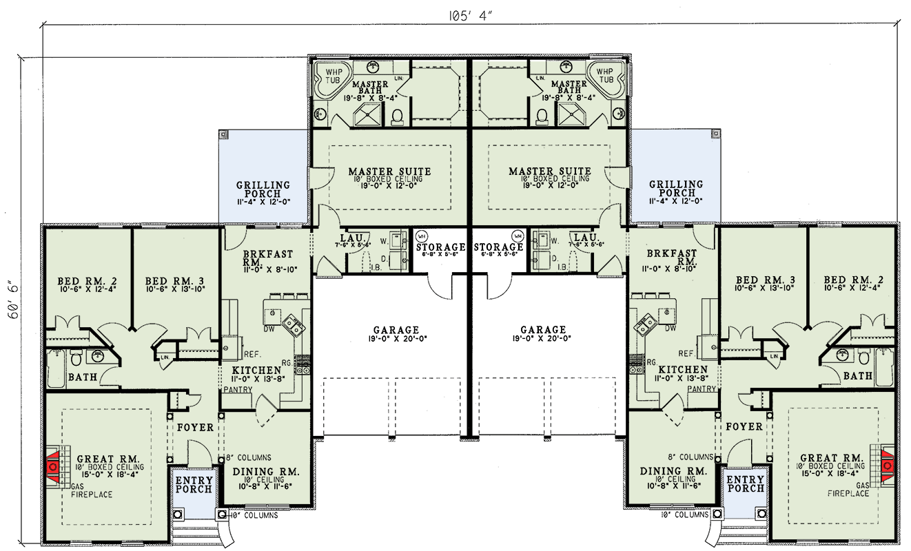 - Footprint per Unit: ~52′ 8″ × 60′ 6″; roof height ~25′ 0