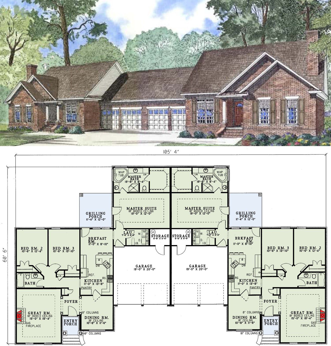 - Design Style: Traditional duplex, mirrored units, classic foyer & dining layout, attached garages, small grilling porch, three-bedroom comfort. 0