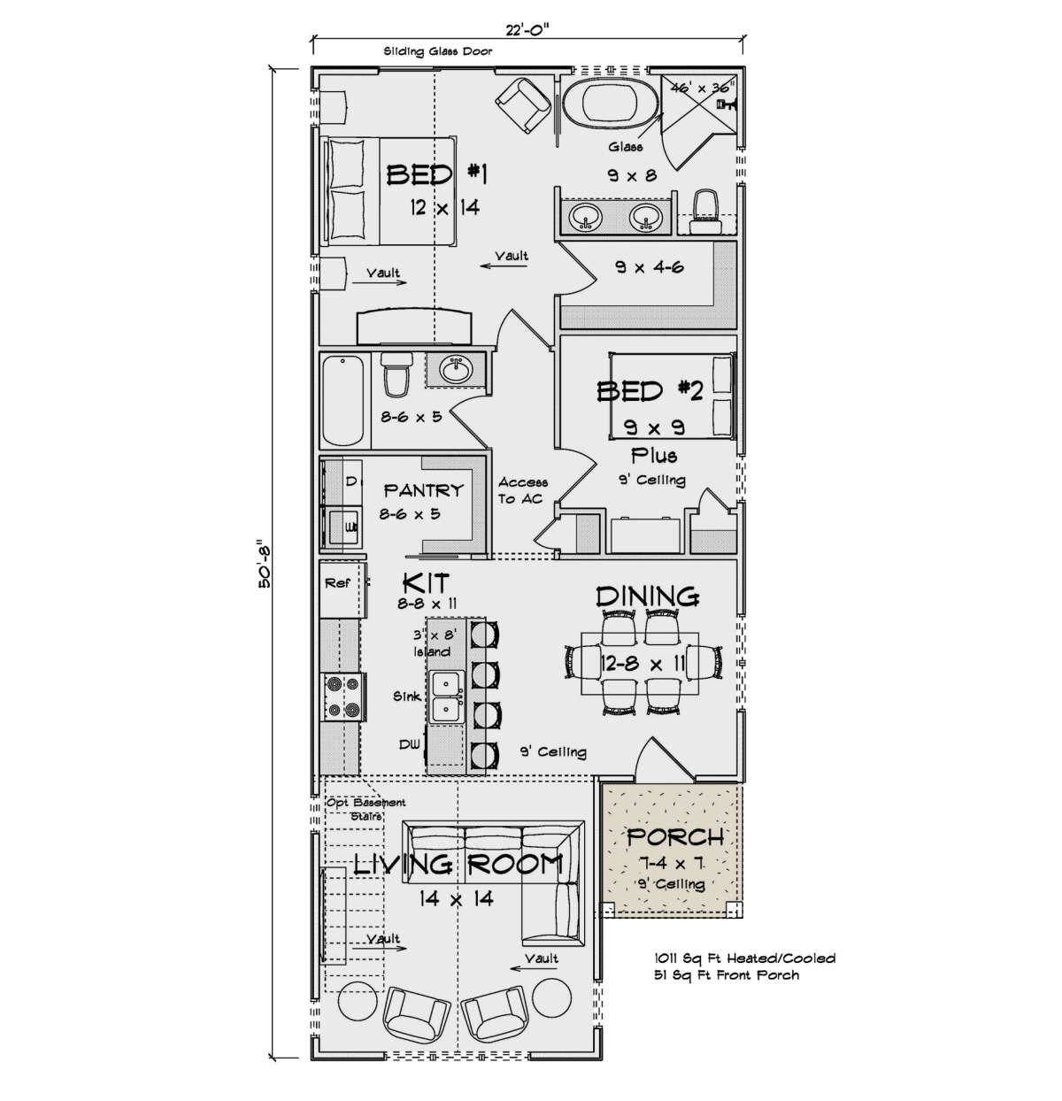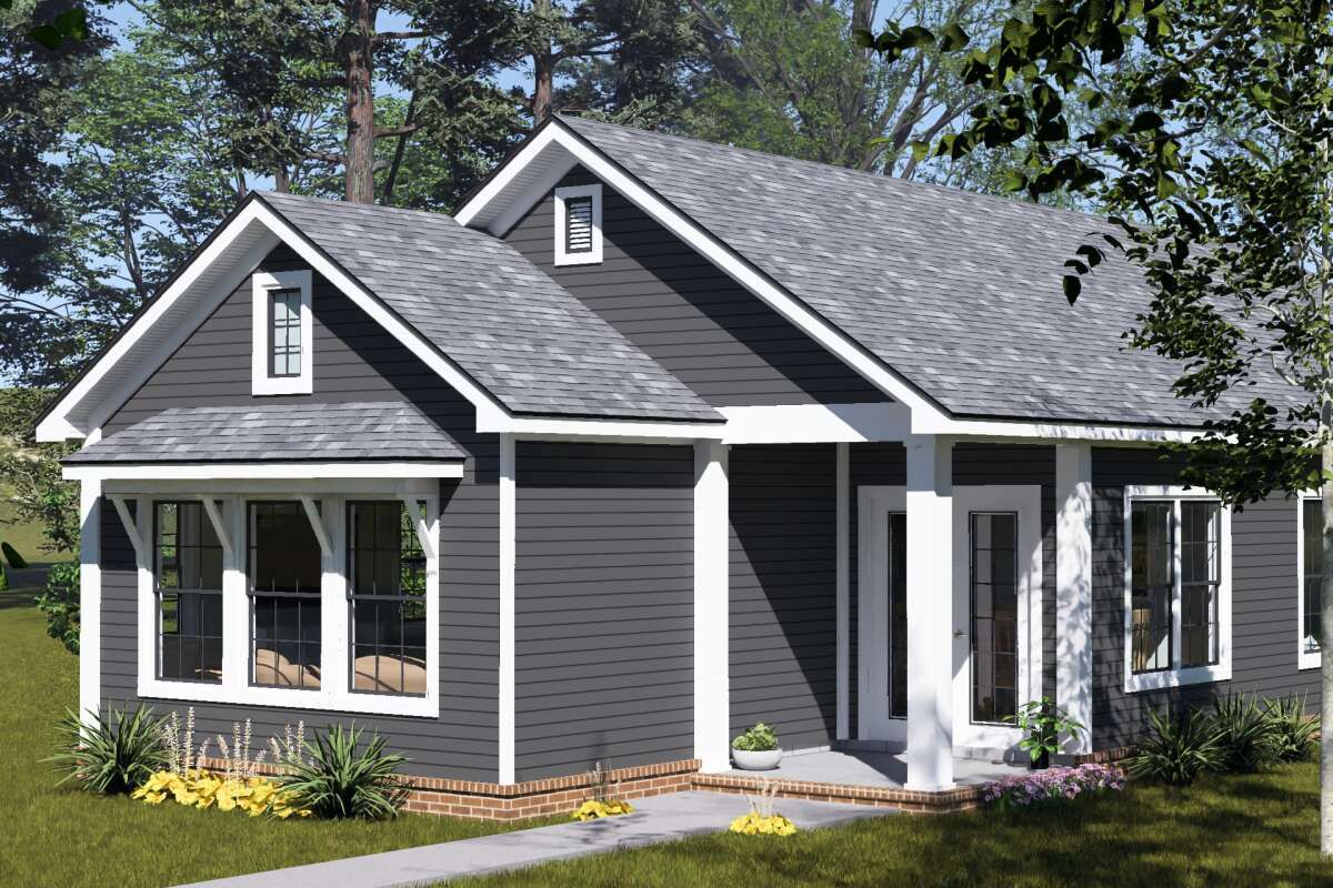 This compact and thoughtfully designed traditional home offers approximately 1,011 square feet of heated living space with two bedrooms and two full bathrooms. Designed as a single-story residence, this plan focuses on simplicity, efficiency, and comfortable everyday living. Its narrow footprint and practical layout make it ideal for small families, couples, or those looking for a downsized yet functional home. 0