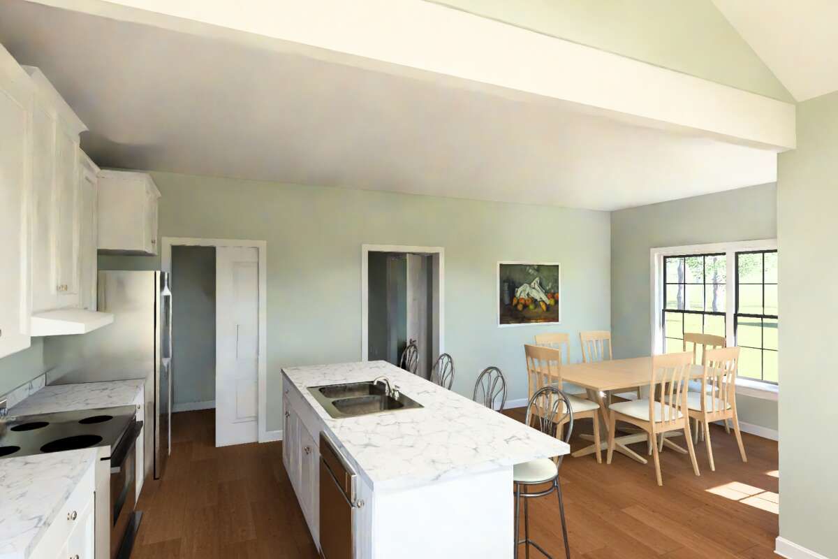 An adjacent dining area provides a comfortable place for meals, maintaining a close connection to both the kitchen and living space.