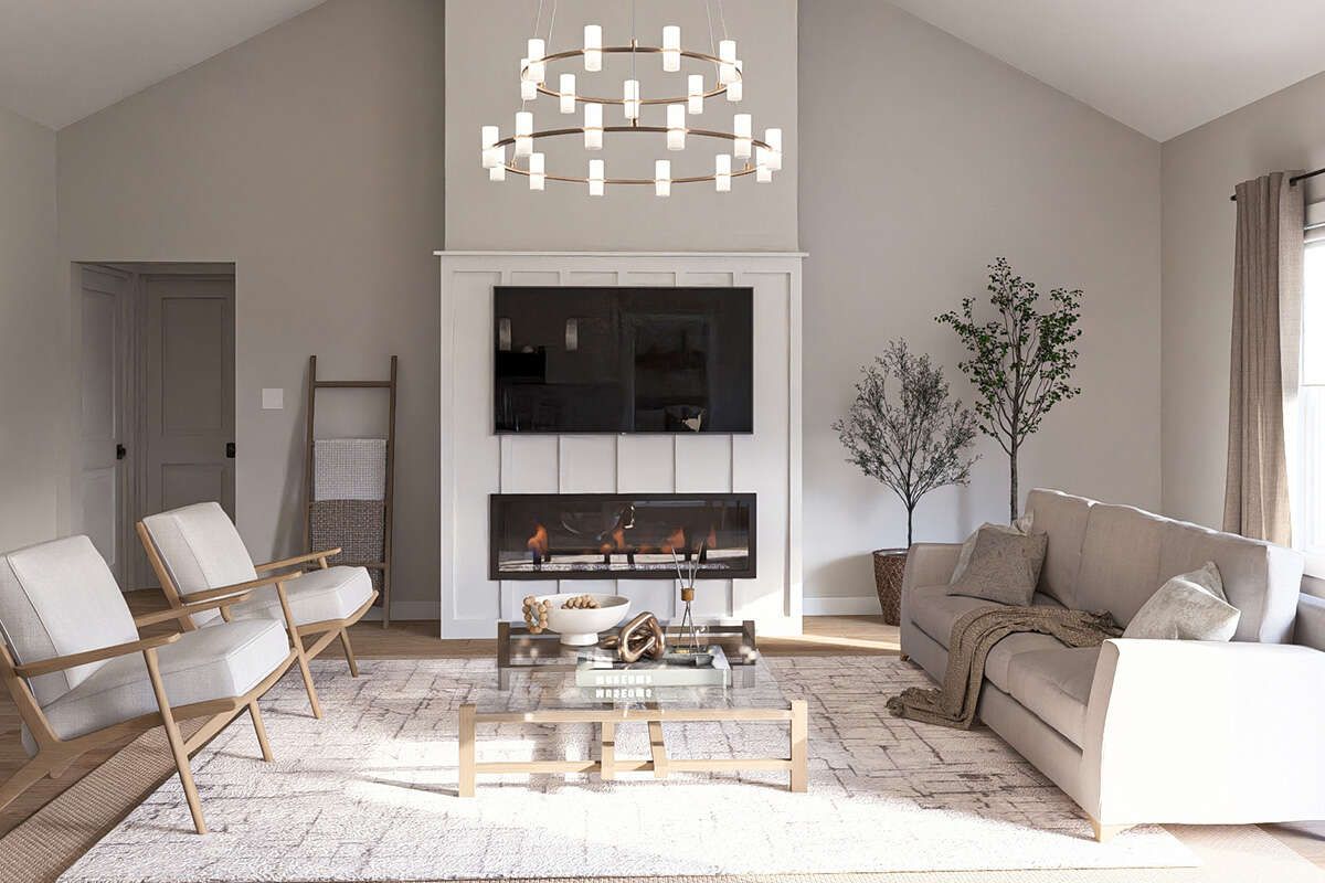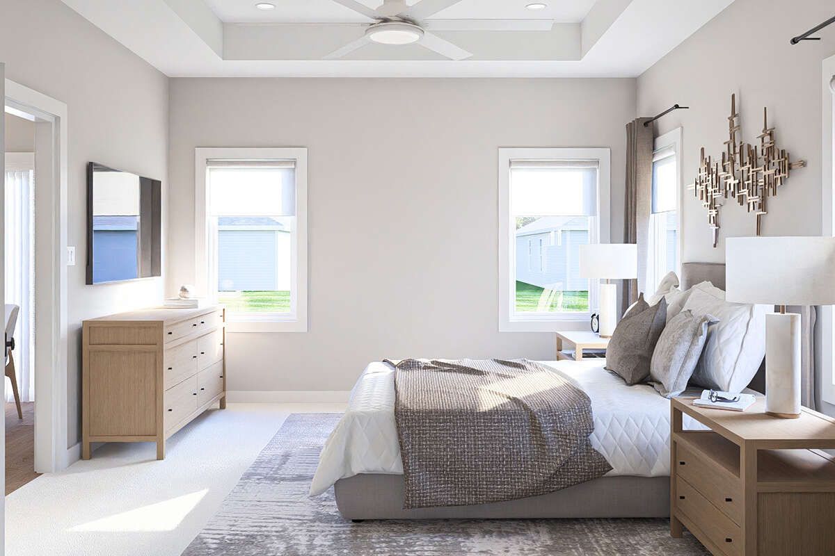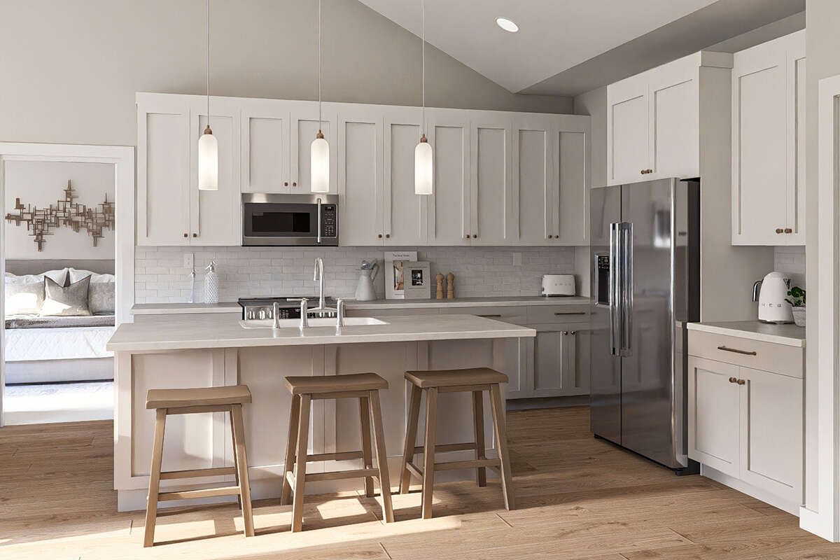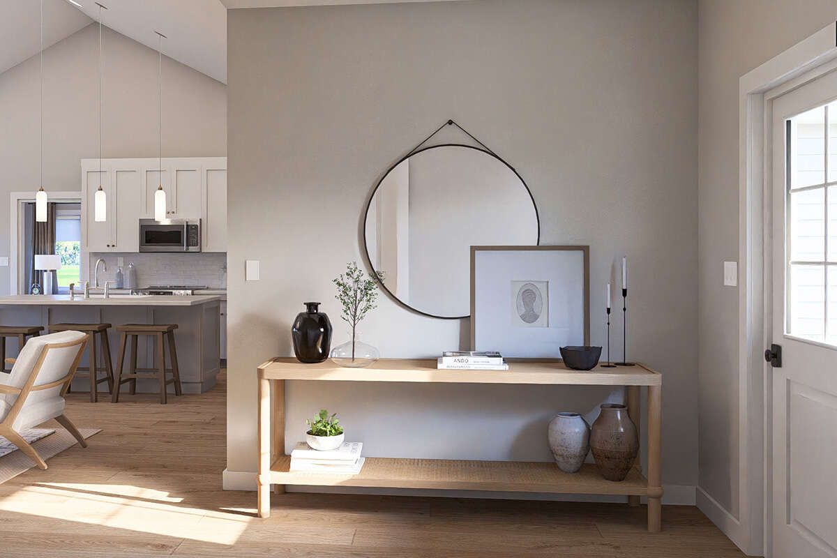 The 1,584 square feet of living space is arranged entirely on one level, providing easy movement throughout the home. The layout is designed to balance open living areas with private bedroom spaces, ensuring both comfort and functionality.