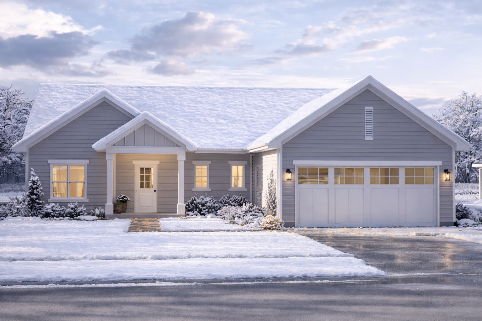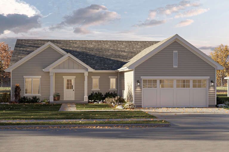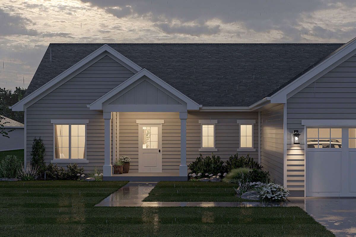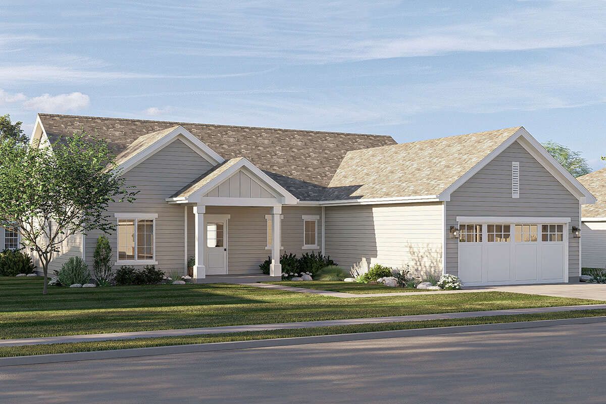 Large windows enhance natural light while maintaining a classic look, and the overall design emphasizes durability and low-maintenance construction. The inclusion of a two-car garage adds convenience and blends seamlessly into the home’s exterior profile. 1