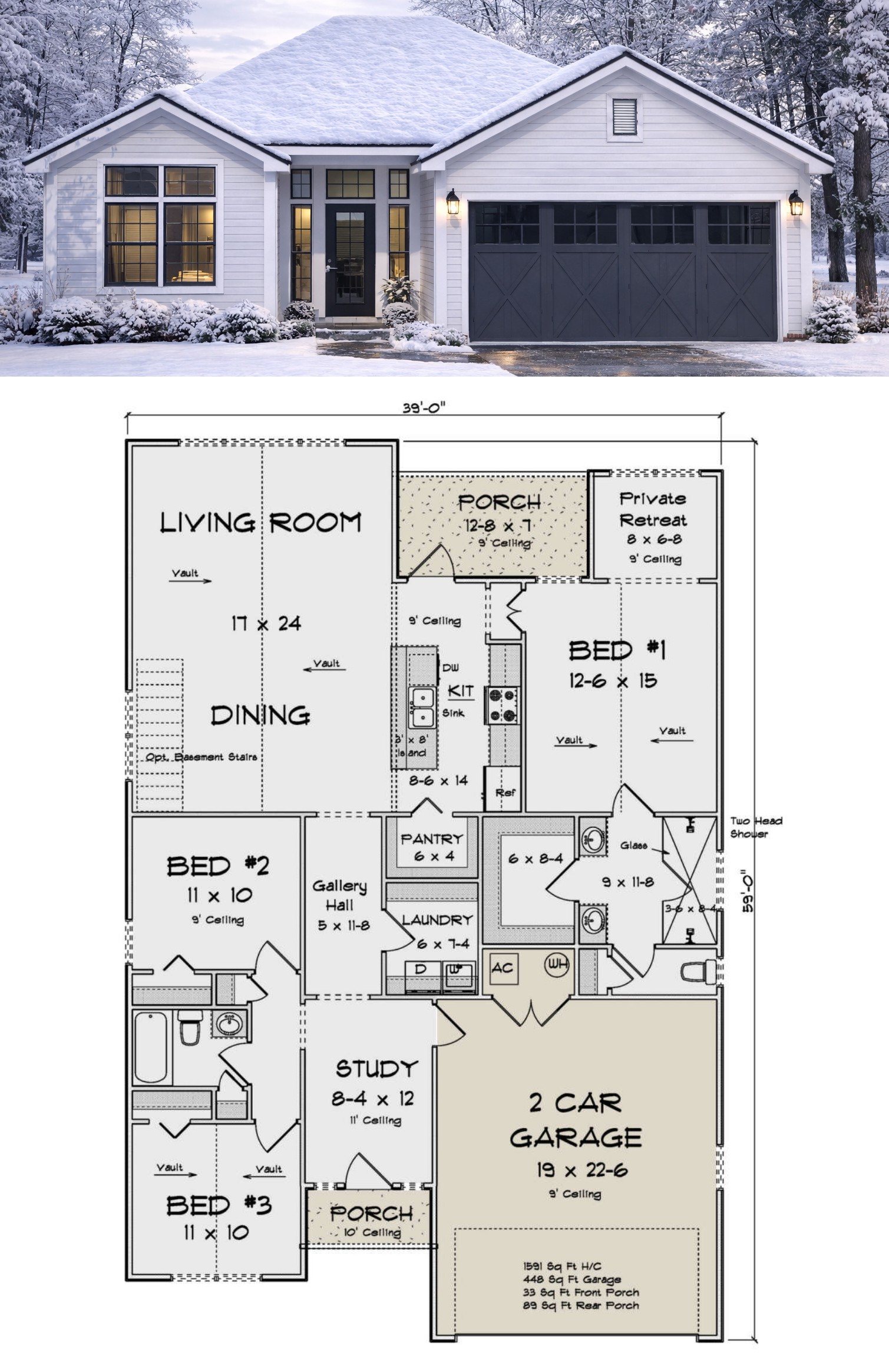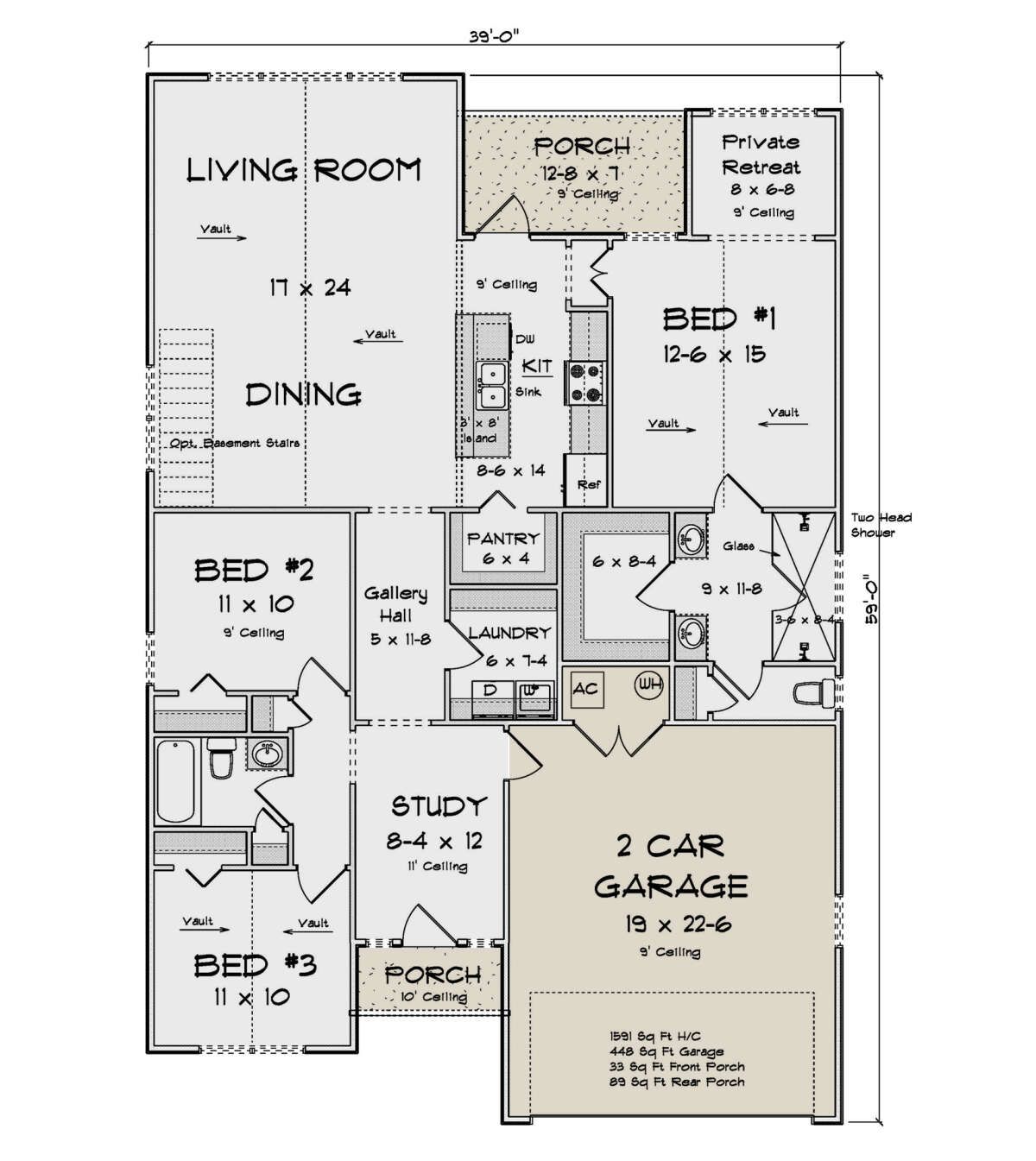 The home measures approximately 39′ wide and 59′ deep, with a total heated area of 1,591 square feet. It is designed as a one-story structure, making it suitable for a wide range of homeowners. 6