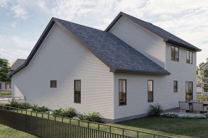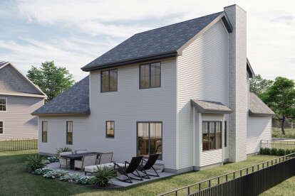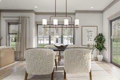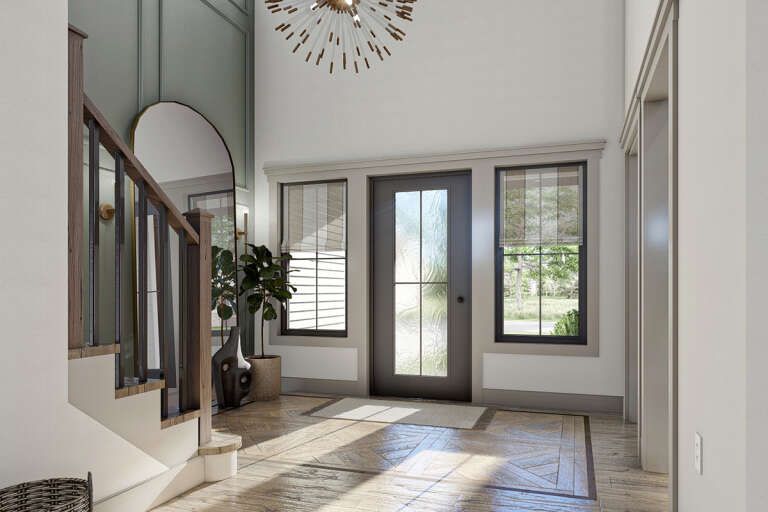 The exterior of this traditional plan delivers enduring curb appeal with a symmetrical façade, classic rooflines, and a welcoming entry. 1 Spanning roughly 44′-8″ wide × 48′ deep, the two-story silhouette gives the home a timeless presence, while the covered front porch enhances the welcoming feel and provides a relaxed spot for morning coffee or greeting guests. 2 A mix of traditional siding, carefully placed windows, and architectural detailing creates an elegant exterior that’s both classic and comfortable. 3