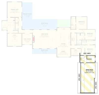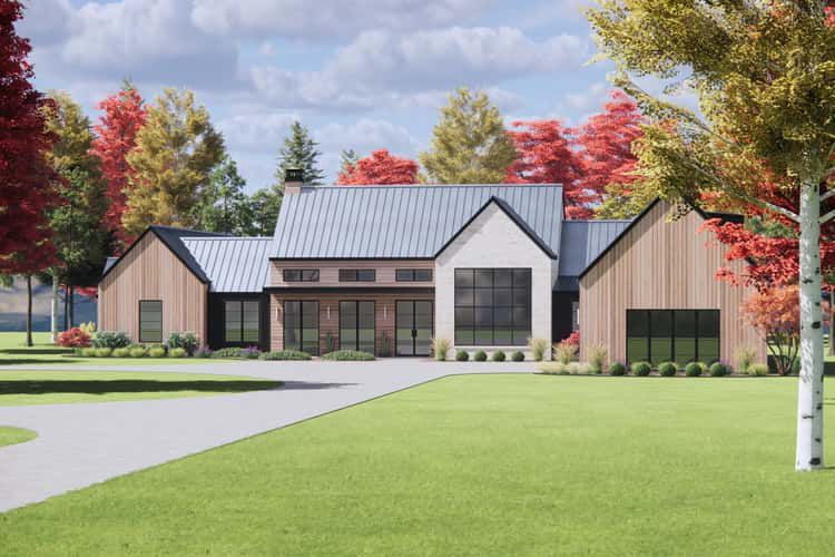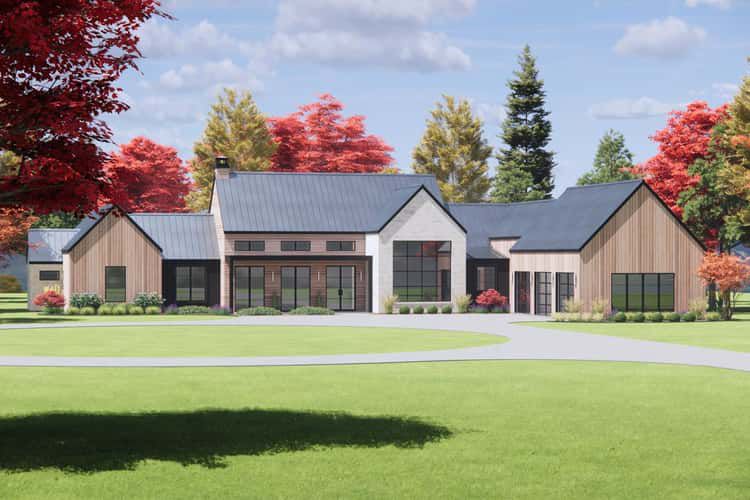 This transitional farmhouse plan brings together classic charm and modern functionality. Its open great room, generous outdoor spaces, private master wing, and flexible bonus area make it ideal for families who value both everyday comfort and entertaining in a refined, well-proportioned layout.