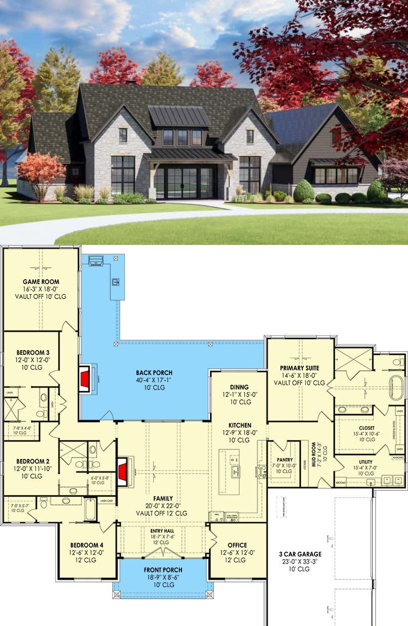 This transitional farmhouse plan offers a rare blend: a spacious, modern, open layout — and classic farmhouse warmth and character. It’s designed for realistic, everyday living while still offering room for entertaining, work-from-home, leisure, and family growth. With 4 bedrooms, a home office, game room, and generous indoor-outdoor living space — this design flexes to the needs of today’s families. If you want a home that’s practical, stylish, flexible, and built to last — this one definitely delivers.